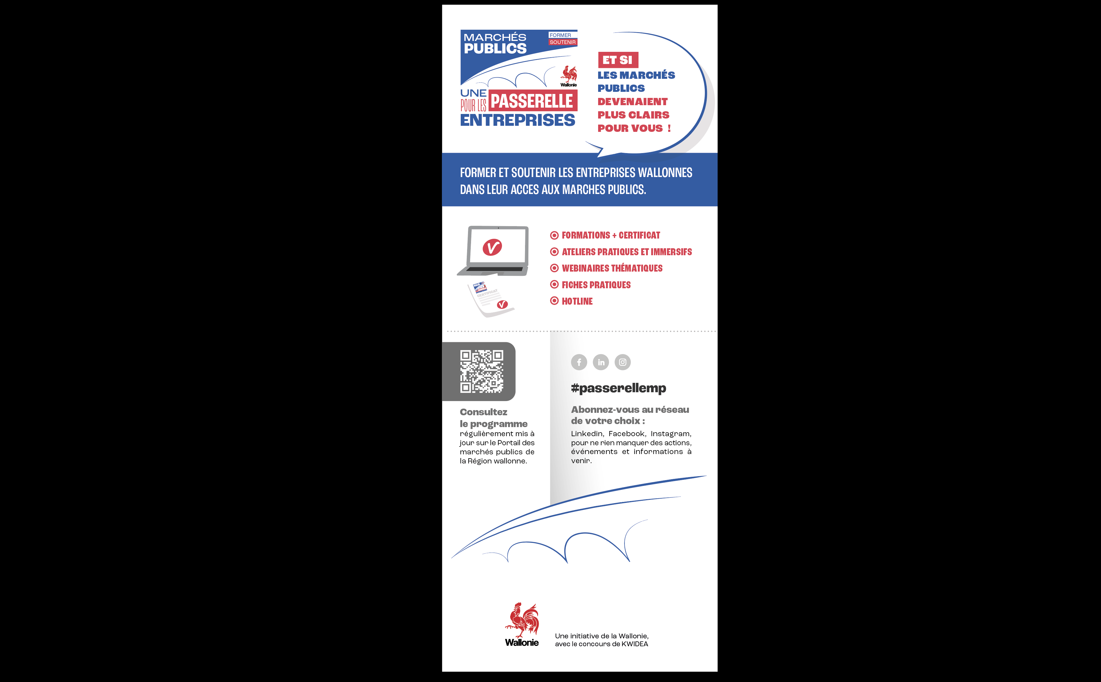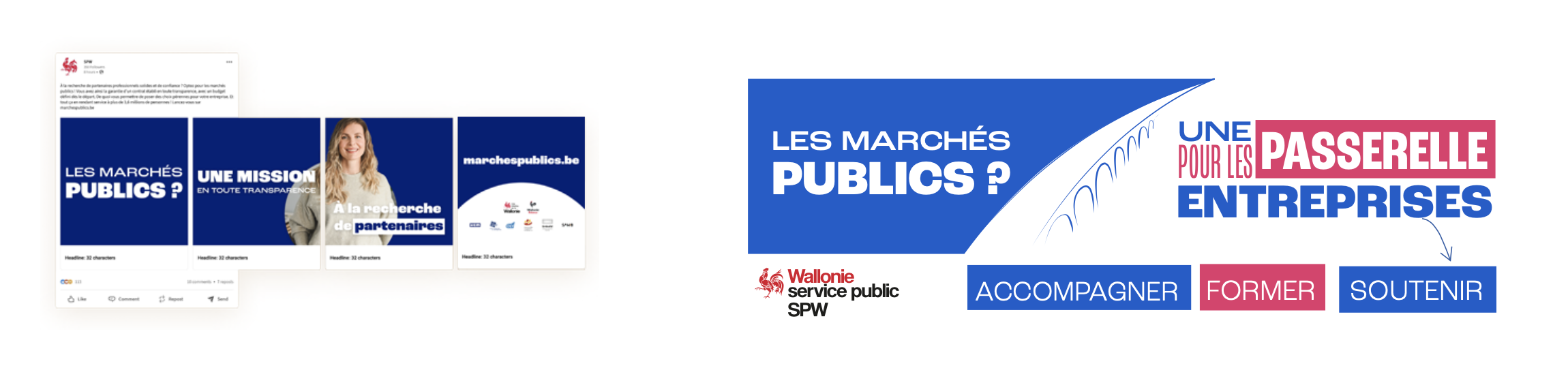 La complexité était de réaliser une identité qui en réunissait d'autres. Une demande de s'inspirer de la précédente campagne des Marchés Publics de 2020 et à la fois de l'identité du nouveau site web et la charte graphique de la SPW avec seul référence les codes couleurs RGB pour certains et CMJN pour d'autres.